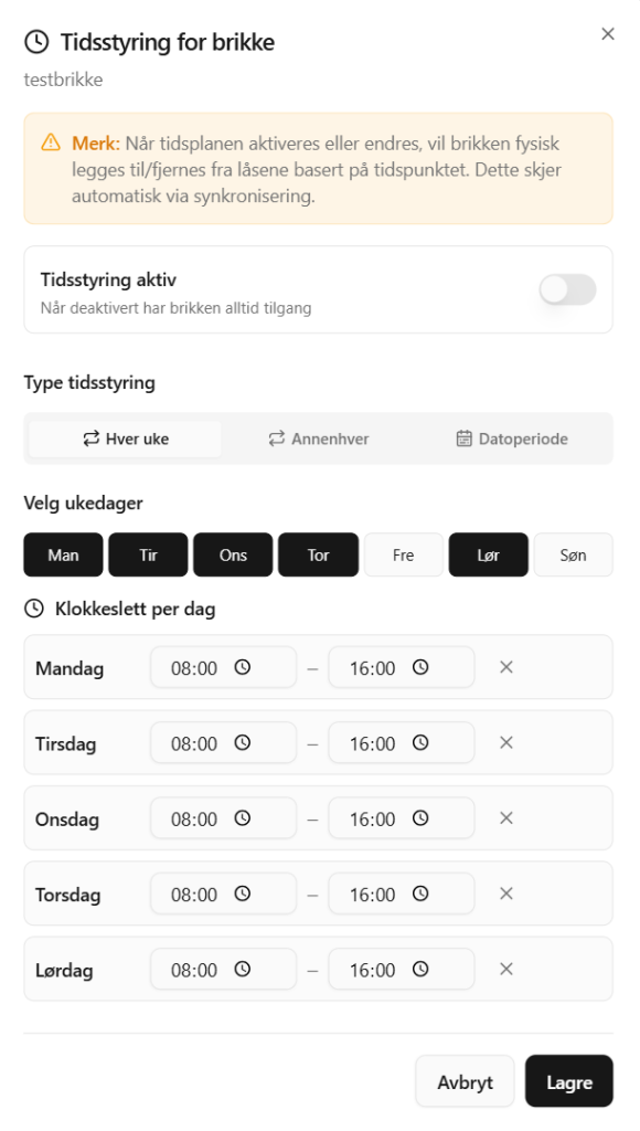 - Fleksibel tidsstyring per dag og uke - Gi adgang mellom bestemte klokkeslett – hver dag, utvalgte dager, eller annenhver uke.